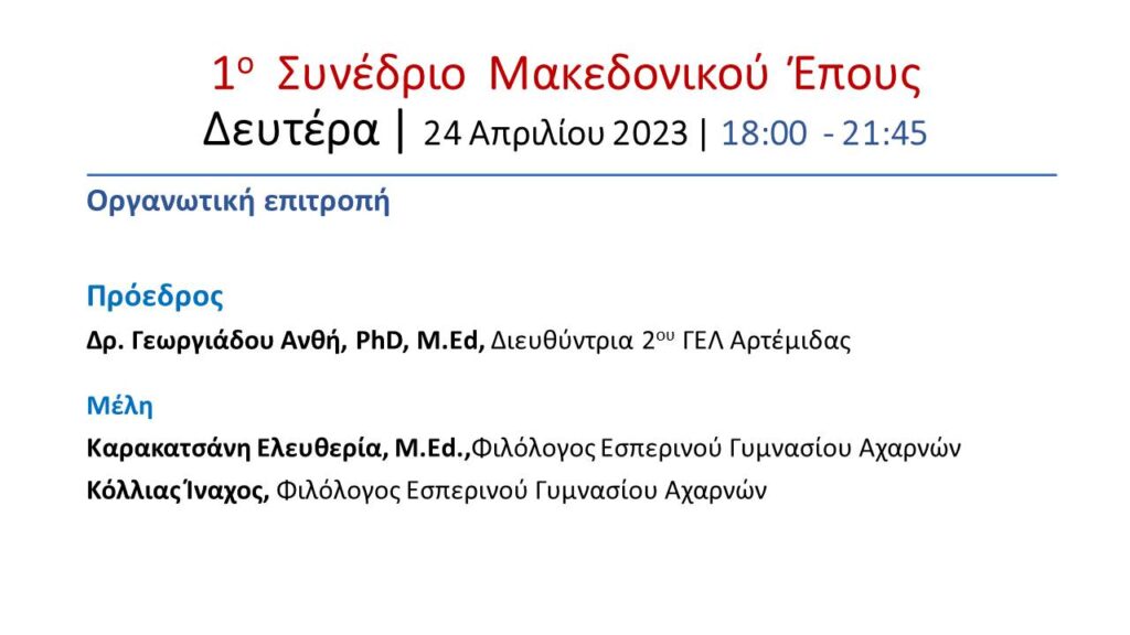 ΟΡΓΑΝΩΤΙΚΗ ΕΠΙΤΡΟΠΗ 1ου ΣΥΝΕΔΡΙΟΥ ΜΑΚΕΔΟΝΙΚΟΥ ΕΠΟΥΣ ΣΥΝΔΙΟΡΓΑΝΩΣΗ ΣΥΝΕΔΡΙΟΥ ΔΗΜΟΣ ΑΧΑΡΝΩΝ ΔΗ.Κ.Ε. ΑΧΑΡΝΩΝ ΕΣΠΕΡΙΝΟ ΓΥΜΝΑΣΙΟ ΑΧΑΡΝΩΝ ΕΙΣΗΓΗΤΗΣ Μανδράκης Χρήστος MSc, MSc, Διευθυντής Εσπερινού Γυμνασίου Αχαρνών