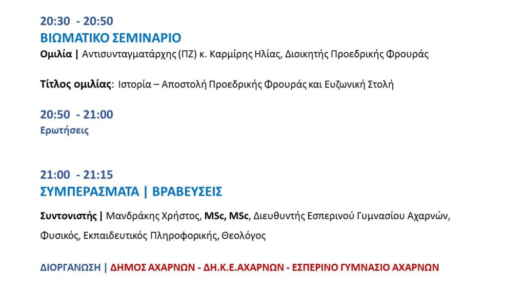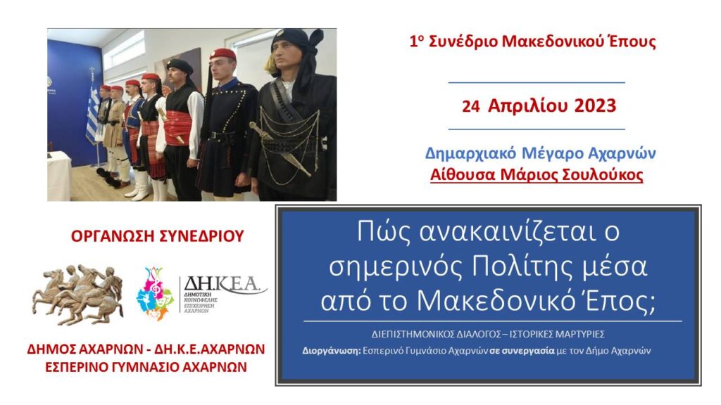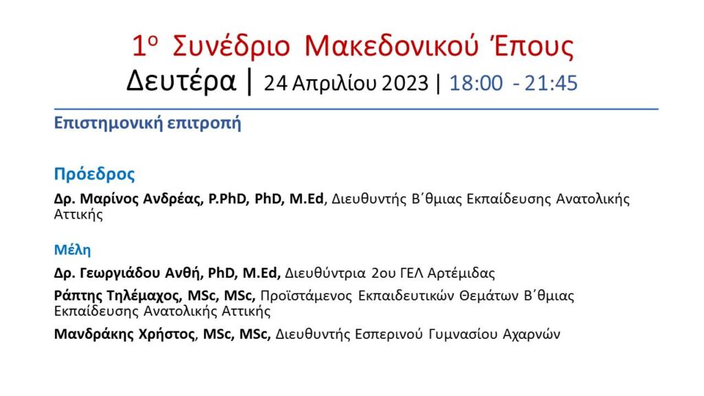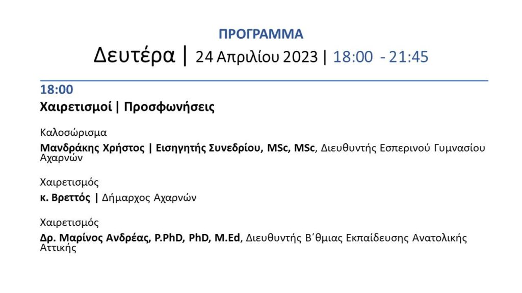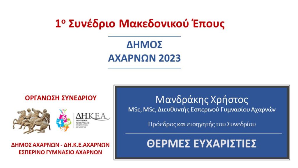 ΠΡΟΓΡΑΜΜΑ 1ου ΣΥΝΕΔΡΙΟΥ ΜΑΚΕΔΟΝΙΚΟΥ ΕΠΟΥΣ ΣΥΝΔΙΟΡΓΑΝΩΣΗ ΣΥΝΕΔΡΙΟΥ ΔΗΜΟΣ ΑΧΑΡΝΩΝ ΔΗ.Κ.Ε. ΑΧΑΡΝΩΝ ΕΣΠΕΡΙΝΟ ΓΥΜΝΑΣΙΟ ΑΧΑΡΝΩΝ ΕΙΣΗΓΗΤΗΣ Μανδράκης Χρήστος MSc, MSc, Διευθυντής Εσπερινού Γυμνασίου Αχαρνών